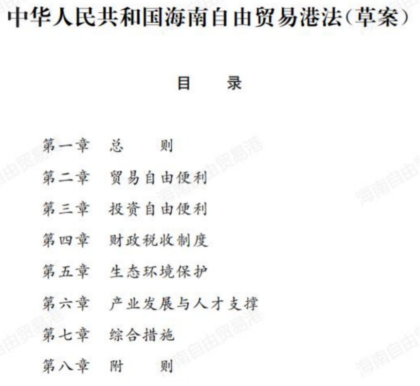 1月4日,据中国人大网消息,第十三届全国人大常委会第二十四次会议对《中华人民共和国海南自由贸易港法(草案)》(下称“草案”)进行了审议。草案分为八章,共五十四条内容,包括总则、贸易自由便利、投资自由便利、财政税收制度、生态环境保护、产业发展与人才支撑、综合措施、附则。目前草案已公布并面向社会公众征求意见,征求意见时间截止到2021年1月29日。